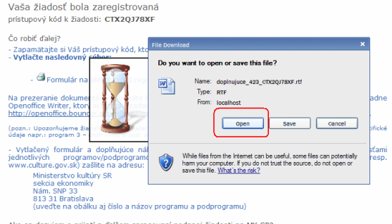 dotácie“ sa zobrazí dialóg na prebratie súboru. Kliknite na tlačidlo “otvoriť”,