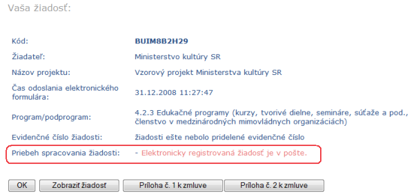 stavom jej spracovania. Stlačením tlačidla “OK” sa vrátite na úvodnú stránku.